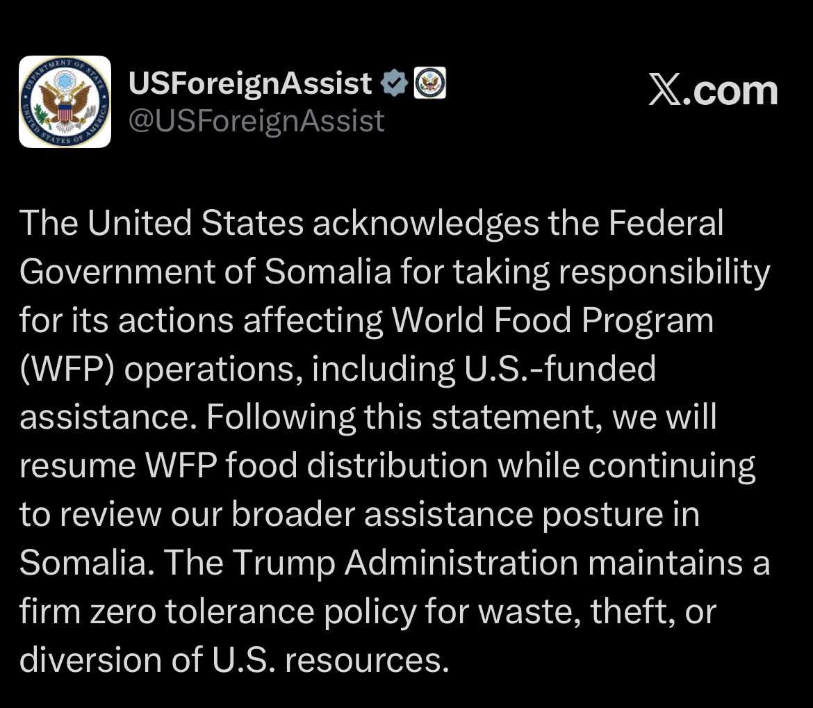 Xafiiska gargaarka shisheeye ee hoos yimaada wasaarada arimaha dibedda Mareykanka ayaa qoray sidan, “Mareykanka wuxuu aqbalay masuuliyadda dowladda Soomaaliya ay ku qaadatay falkii loo geestay howlaha hay’adda WFP. Kadib qirashada, waan fasaxaynay howlahii WFP balse wali waxaan dib-u-eegis ku wadnaa howlaha guud ee Soomaaliya.
